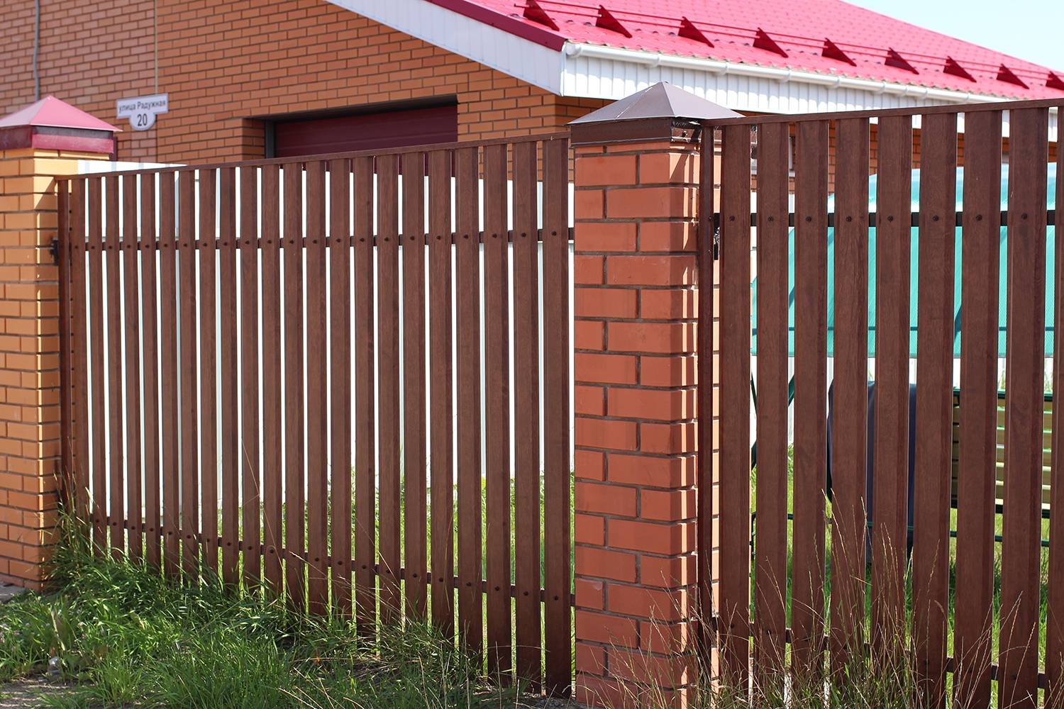 Заборы и ограждения из евроштакетника с кирпичными столбами 8 соток в Кашире